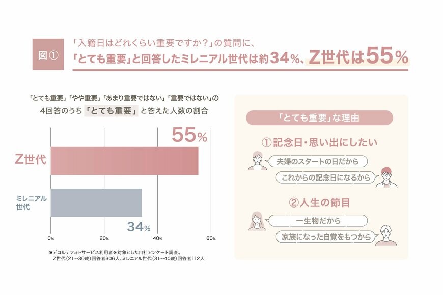 同社がデコルテフォトサービス利用者に調査したところ、「入籍日はとても重要」と回答したミレニアル世代(31~40歳)が34%だったのに対して、Z世代(21~30歳)は55%と上回りました。