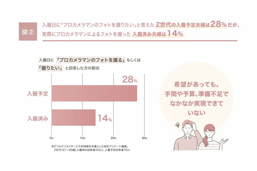 一方、実際に入籍日に「プロカメラマンのフォトを撮る、あるいは撮りたい」と回答した割合は、入籍予定のカップルで28%、入籍済のカップルで14%と低く、理想と現実にはギャップがありました。