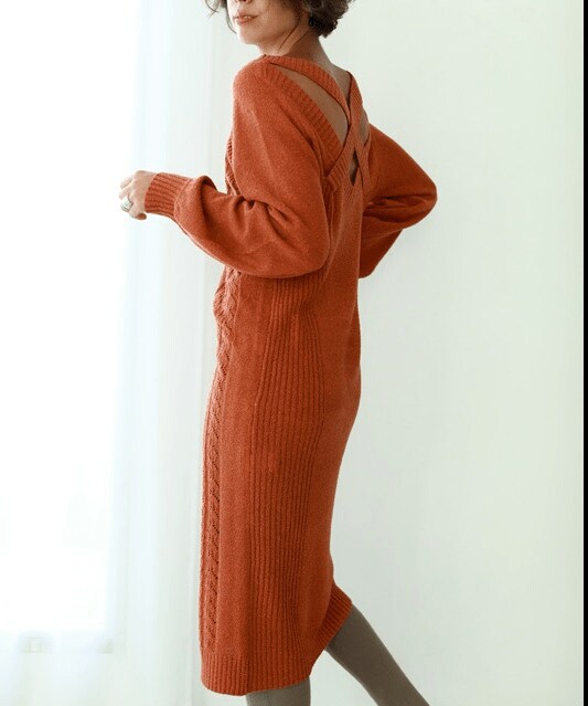 クロスになったバックスタイルと肌見せで、ヘルシーさを演出したワンピース。柄編みやリブ編みなどを組み合わせた女性らしいシルエットが魅力です。