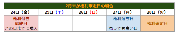 - 権利確定日:この日までに株主名簿に名前が載っている必要があります。