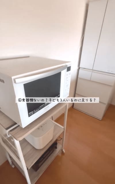 キッチンも必要最小限の家電と家具となっており、電子レンジラックと冷蔵庫のみが置かれています。