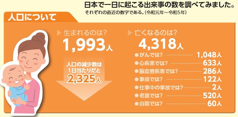 厚生労働省が公表する「日本の1日」をみることで、日々の生活の中での出来事のようにイメージしやすく、物事の発生頻度や規模感を把握しやすくなります。日本で1日に起こる出来事の数を調べてみた「日本の1日」をみていきましょう。