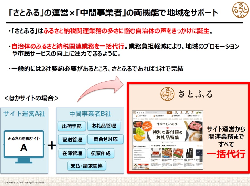 仲介サイトとしてだけでなく中間事業者としても存在感を発揮しており、他社サイトのお礼品登録などをさとふるに一元化する「おまとめらくらくサービス」を展開するなど、自治体の負担軽減にも貢献しています。