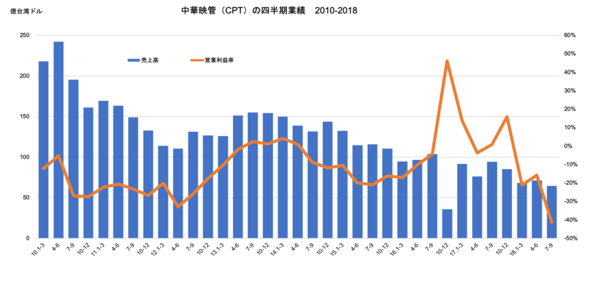 中国液晶メーカーの追い上げなどに対し、近年は車載パネルへのシフトなどで製品ポートフォリオの転換を図っていたが、直近の18年7~9月期業績は、売上高が前年同期比32%減の64億台湾ドル、営業損益は27億台湾ドルの赤字となり、営業利益率は10年以降で最低のマイナス41%に落ち込んでいた。