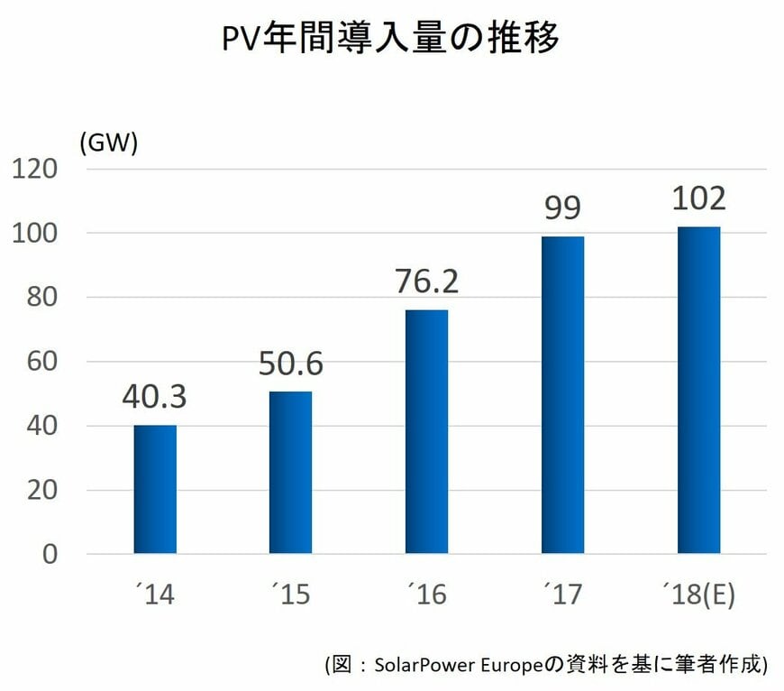 2018年の太陽光発電(PV)の世界導入量は、最大市場である中国の政策変更や各国のセーフガード(緊急輸入制限措置)の影響で成長が鈍化する見込みだ。一方、価格下落が進んだことで、FIT(固定価格買取制度)などの補助金に頼らない市場成長も進んでいる。