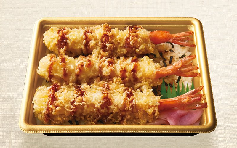 「大海老天重」(税込900円)は大ぶりの海老天を3尾使用。ごま油の香りが広がる上がけのタレに加えて、醤油の香りと甘みのあるだしの効いたタレを別添しています。
