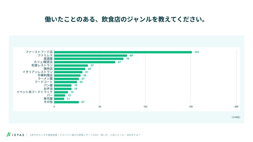 ファーストフードやファミレス、カフェといった、比較的カジュアルで未経験からでも始めやすいジャンルでの経験が多いようです。これらの飲食店は友人同士で応募したり、学校の近くで探したりしやすいため、Z世代に選ばれているのではないでしょうか。