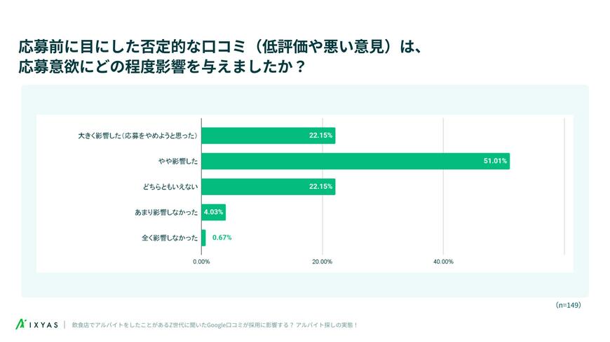 「応募前に目にした否定的な口コミ(低評価や悪い意見)は、応募意欲にどの程度影響を与えましたか?」という質問に対して「大きく影響した(応募をやめようと思った)」が22.15%、「やや影響した」が51.01%となりました。合わせて7割以上が応募意欲に影響しているとわかります。