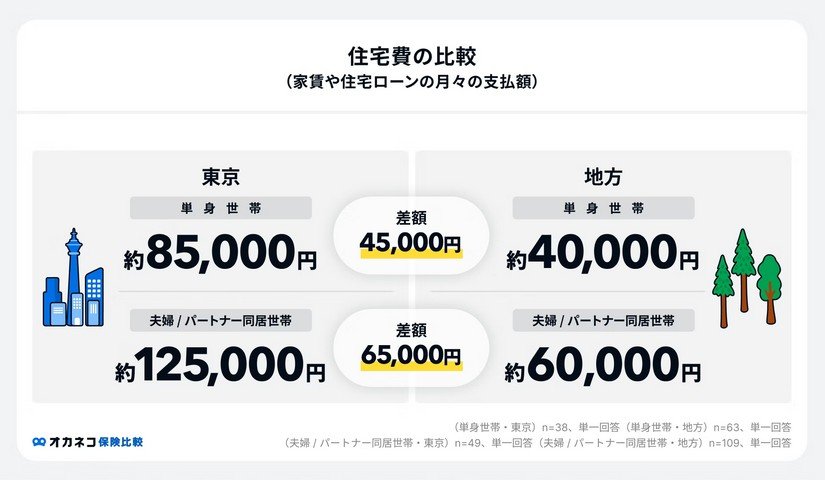 まず単身世帯は東京で約8万5000円、地方で約4万円で4万5000円の差がでました。そして、夫婦/パートナー同居世帯では、東京で約12万5000円、地方では約6万円となっており、ほぼ2倍の差という結果に。
