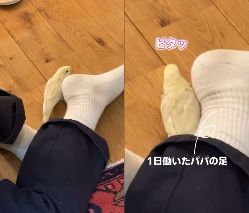 「1日働いたパパの足はインコにとって居心地がいいらしい...」