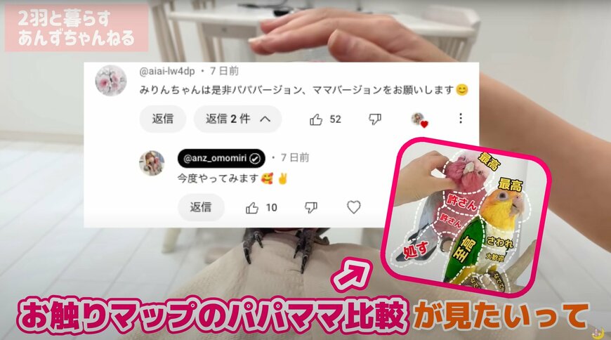 1. 【インコのお触りマップ】視聴者さんからのリクエスト「みりんちゃんのパパママお触りマップ」