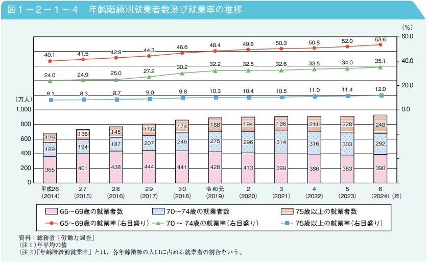 2025年6月10日に内閣府が公表した「令和7年版高齢社会白書」によると、シニア世代の就業率は年々上昇しています。