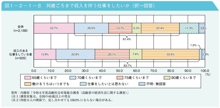 特に、現在すでに収入を伴う仕事をしている人に限ると、「働けるうちはいつまでも」と答えた割合は33.5%にのぼり、シニア世代の高い就業意欲がうかがえます。