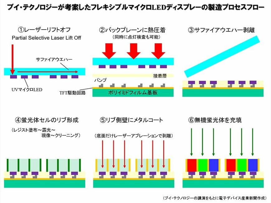 ブイ・テクノロジーは、UV発光するマイクロLEDを独自のリブ構造と蛍光材料で色変換するフレキシブルLEDディスプレーの基本技術を考案した。開発中のフレキシブルLEDディスプレーは、バックプレーン(駆動回路)を形成したポリイミド(PI)基板上にUVマイクロLEDチップを実装し、このLEDを高さ20μm×幅7μmのリブで囲み、この中に色変換層となる蛍光体レジストを充填した構造を持っている。
