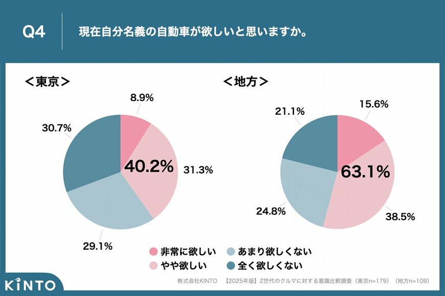 「現在自分名義の自動車が欲しいと思いますか」という質問では、東京のZ世代の40.2%が「非常に欲しい」「やや欲しい」と回答。地方では63.1%が同様に所有したいと答えています。