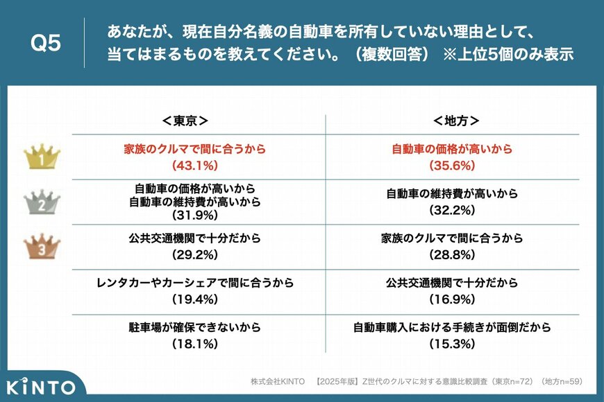 東京で自分名義の自動車を所有していない理由の上位は「家族のクルマで間に合うから」(43.1%)、「自動車の価格が高いから」(31.9%)、「自動車の維持費が高いから」(29.2%)でした。