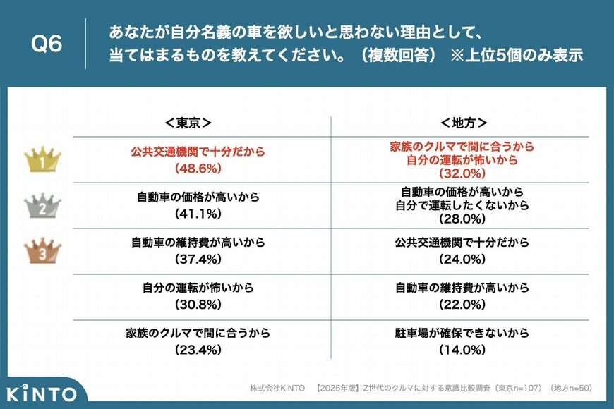 ちなみに「自分名義の車を欲しいと思わない理由」として挙げられているのは、東京では「公共交通機関で十分だから」(48.6%)が最も多く、次いで「自動車の価格が高いから」(41.1%)、「自動車の維持費が高いから」(37.4%)と続きます。