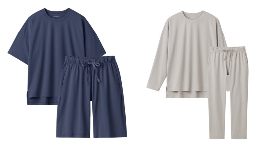 ラインナップは長袖・長パンツセット(税込1万9800円)と半袖・半パンツセット(税込1万7600円)を用意しています。カラーはネイビーとグレージュの2色。サイズはXS/S/M/L/LL/3Lの5サイズを揃えています。