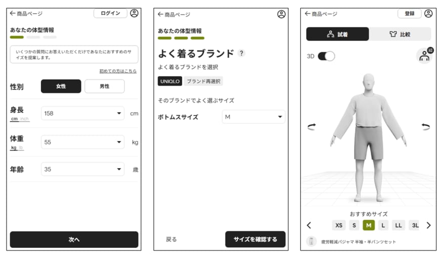 オンラインでもぴったりのサイズが選べるように、公式サイトではサイズ診断サービスも展開しています。体型情報や普段着ているブランドのサイズを選択することで、自分に最適なサイズが分かるもので、3Dモデルで着用イメージを確認することもできます。