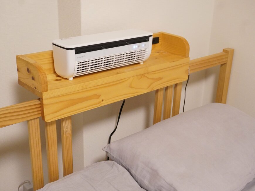 洗面所以外でも活躍の場はありました。例えば、寝室。こちらも我が家ではエアコンが設置されていない暑さ対策が難しい場所なのですが、クールエアーミストはベッド横のサイドテーブルやベッドフレームに置くことができたので、寝る直前に部屋を効果的に冷やすことができました。