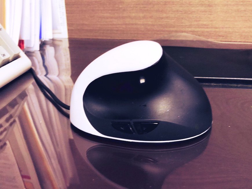 対策として、私は普段、マウスは縦型に近い形状の特殊なマウスを使用しています。これはエルゴノミクス(ergonomics/人間工学:人間が使用する機器・家具・環境・建物などを科学的に分析し、その結果を反映して快適で疲労の少ないものにしようとする工学的アプローチ)と呼ばれるもので、手首をはじめとした骨格への負担を軽減してくれます〈別写真参照〉。
