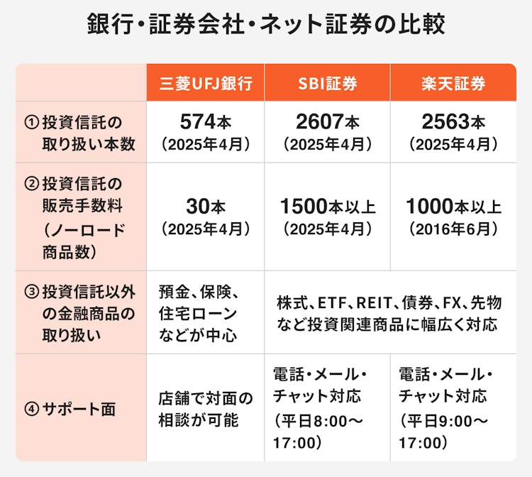 銀行・証券会社・ネット証券の投資信託の取り扱いについて、以下の表も見ながら比較してみましょう。