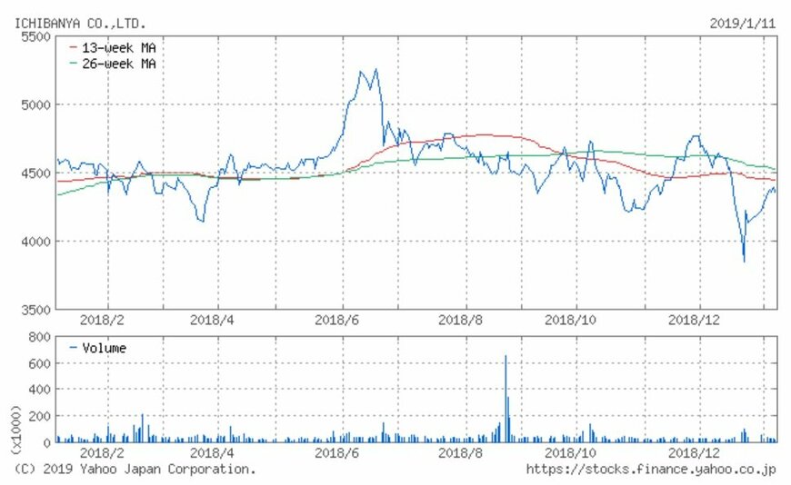 同社の株価は6月の5,300円を天井に下落中です。そして12月には3,815円にまで下落し、安値を更新しました。2019年に入り4,000円台は回復しましたが、依然として下落トレンドが継続しています。