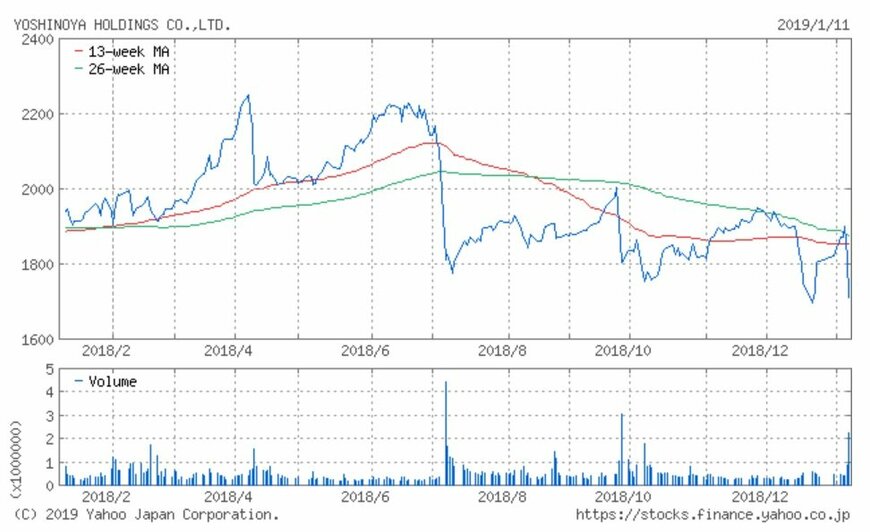 シリーズでお伝えしている「注目小売店月次実績」。今回は牛丼チェーン店「吉野家」他を運営する吉野家HD(9861)の、2018年12月の月次動向及び過去実績、また過去1年の株価動向について振り返ってみましょう。