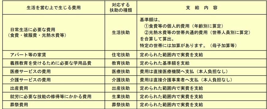 生活保護では、生活を営む上で必要となる費用に対して扶助が支給されます。扶助の名称と支給対象となる費用は次の通りです。