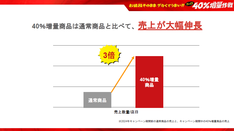 話題性も高いようで、阿部氏は「年々、SNSなどを通じ40%増量作戦の話題量は増加している。実際に売上はキャンペーンの実施期間中には3倍に伸びている」とデータを示しました。