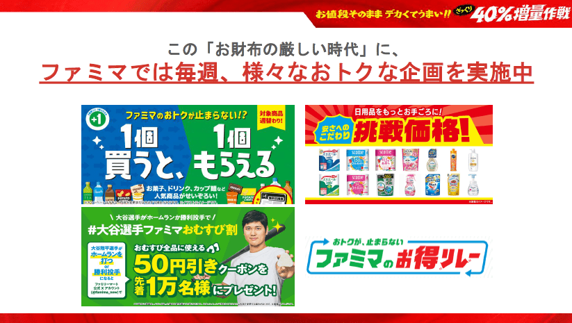 直近で実施されたものだと、「週替わりの対象商品を1個買うと、1個もらえるキャンペーンや大谷選手が活躍するとおむすび全品を対象に50円引きとなる「大谷選手ファミマおむすび割」キャンペーンなどは、記憶に新しいところではないでしょうか。