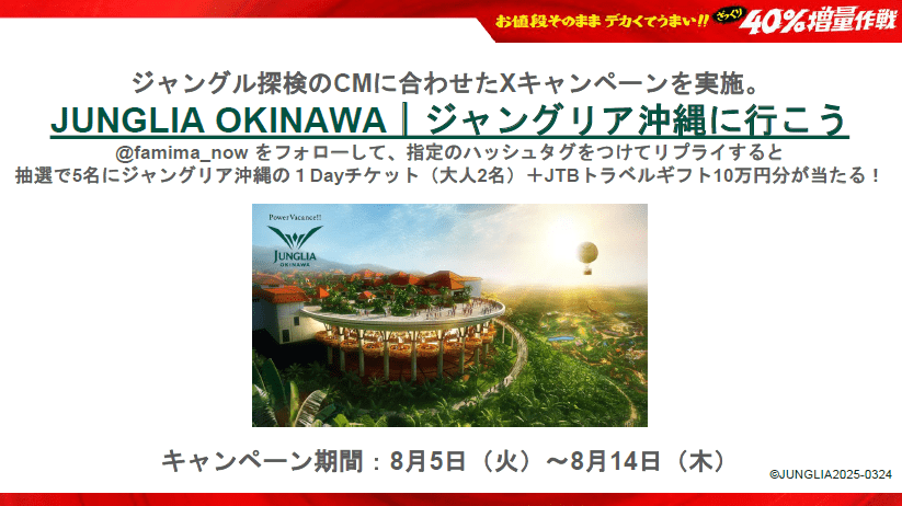 さらに「ざっくり40%増量作戦」では、7月25日にオープンしたばかりの「ジャングリラ沖縄」の1Dayチケット(大人2枚分)とJTBトラベルギフト10万円分が抽選で5名様に当たる、X投稿キャンペーンも実施中。