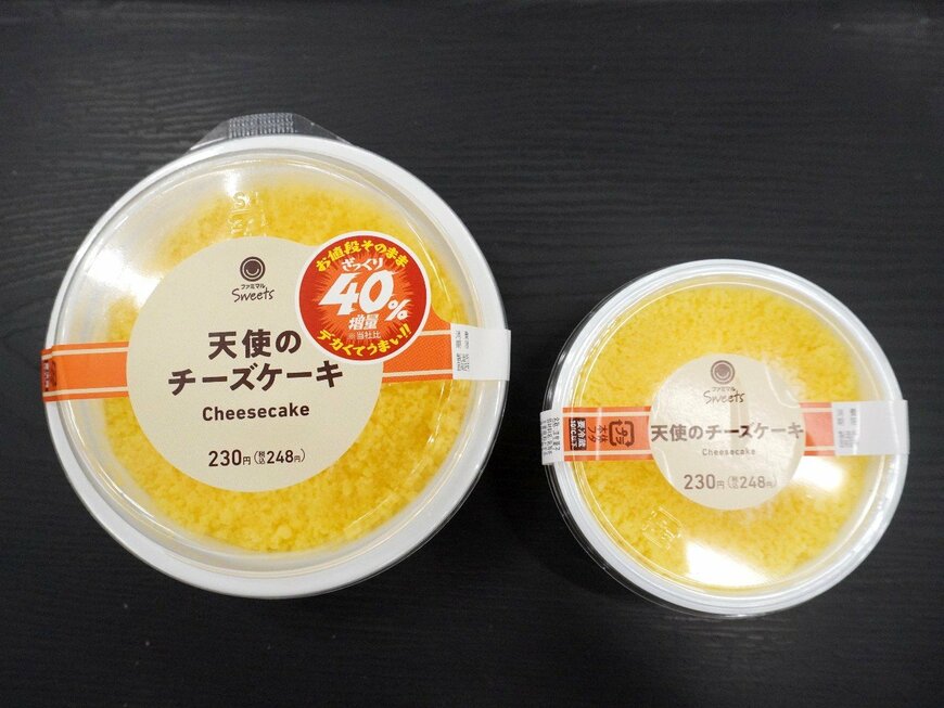 今回の発表会では、通常商品と増量商品の見比べ・食べ比べができました。出てきたのは、看板商品「ファミチキ」と人気スイーツ「天使のチーズケーキ」です。どちらもサイズの違いは明らかで、40%増量どころか2倍くらいあるように感じます。