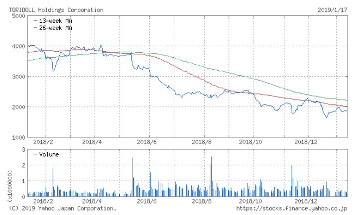 同社の株価は、2017年12月末の4,200円台を天井に下落が続いています。階段状の下落で2018年12月には1,642円に到達。1月に入り1,900~2,000円まで回復しましたが、依然として下落トレンドが継続中です。
