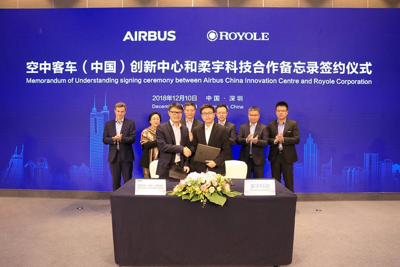 2018年11月に世界初のフォルダブル(折り曲げ可能)スマートフォン「FlexPai」を発表した中国のロヨルは、12月に仏エアバスとフレキシブルエレクトロニクス技術に関する戦略的覚書(MOU)を結んだと発表した。深センに本拠を置くエアバス チャイナ イノベーションセンター(ACIC)と共同で、航空機にフレキシブル有機ELをはじめとする電子技術の実装を目指す。ロヨル創設者兼CEOのBill Liu博士は「私たちの目標は飛行環境、安全性、省エネルギーをさらに向上させ、エアバスの乗客にとって未来的でデジタル化&パーソナライズされた飛行体験を創造すること」と抱負を述べた。