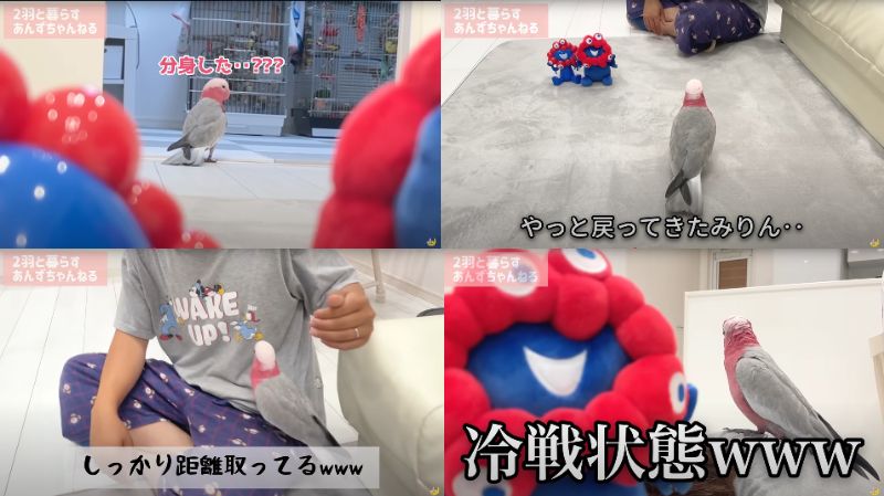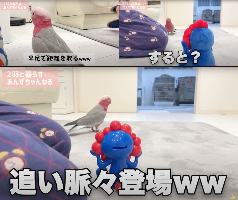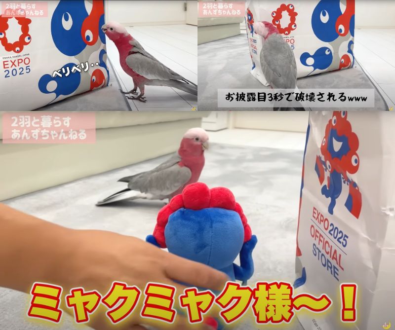 2. 【ミャクミャクとインコ】まさかの「追いミャクミャク」まで(笑)インコの挙動不審が止まらない!