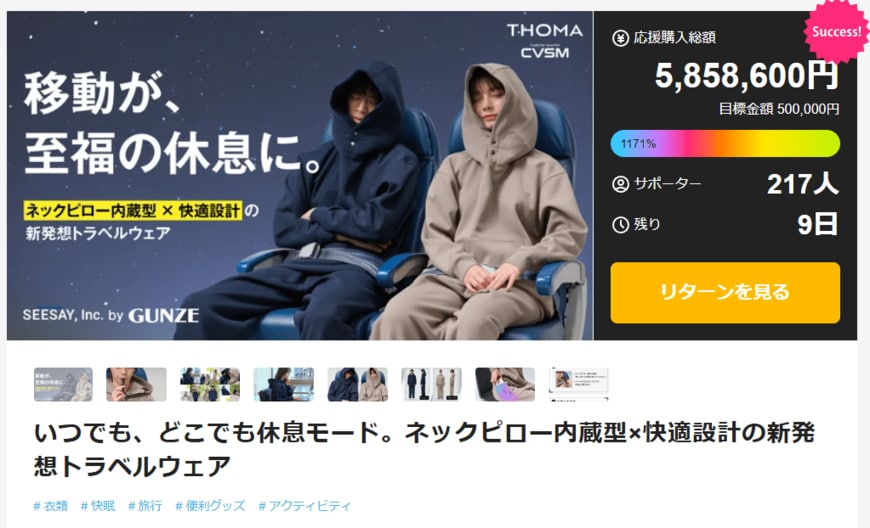 「トラベルフーディー」はクラウドファンディングサイト「Makuake」で、目標金額の1000%を超える支援を集めて話題になっている商品です。