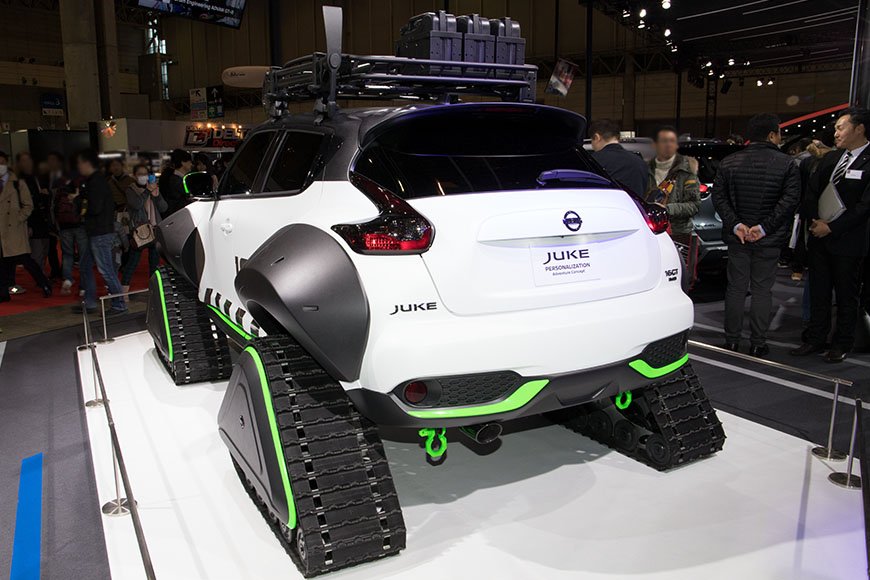 しかし今回展示されていたジュークは、張り出したクローラーに合うようにオーバーフェンダーがぴったりと装着され、クローラーの回転部分には三角形のカバーを装着したことにより安全で、あたかもこういうクルマが最初からあるかのようなしっくり感を持たせつつも、未来チックなフォルムへと進化を遂げていたのだ。
