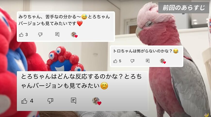 別の動画で「ミャクミャク」に初めて出会ったモモイロインコのインコのみりんちゃんの様子が紹介されていますが、それをみた視聴者さんが「とろろちゃんがミャクミャクに会った様子も見てみたい!」との声が!