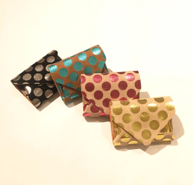 メタリックなドットがかわいいアイテム。お札入れとマチのあるコインポケットを備えているので、小柄ながら収納力抜群。外見だけでなく内側もカラフルになっていて、まさに「裏表のない」お洒落なお財布です。