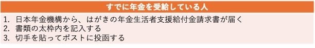年金生活者支援給付金の申請方法は、すでに年金を受け取っている人と新たに年金を受け取っている人で異なります。