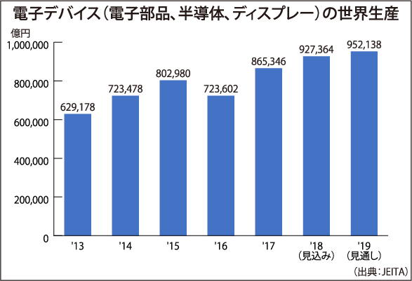 電子情報産業の18年世界生産額は、17年比8%増の2兆9345億ドルで、過去最高の更新が見込まれている。