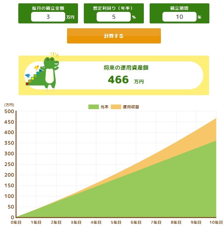 - 10年後の資産額シミュレーション結果:466万円(元本は360万円)