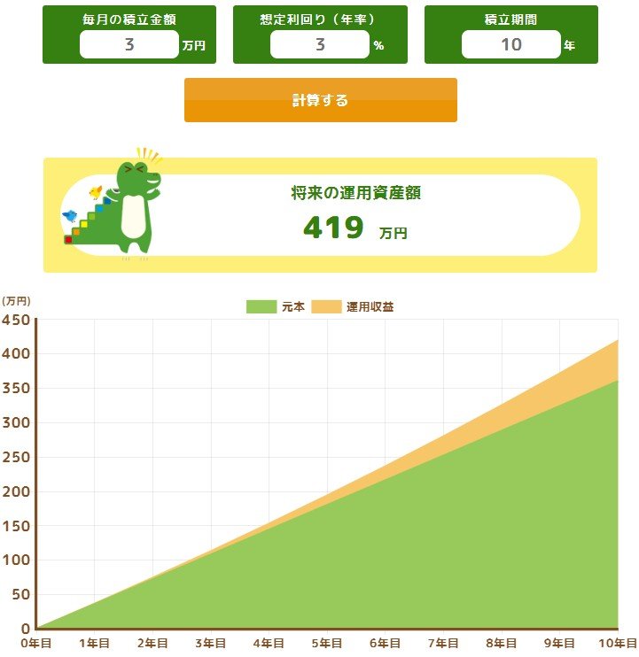 - 10年後の資産額シミュレーション結果:419万円(元本は360万円)