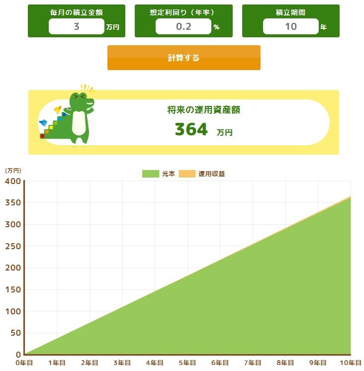 - 10年後の資産額シミュレーション結果:364万円(元本は360万円)