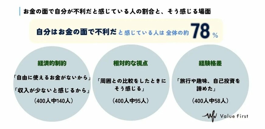 また、78%もの人が「自分はお金の面で不利だ」と感じていることもわかりました。