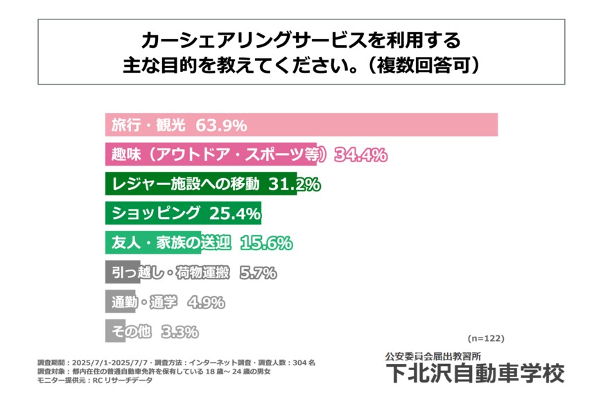 主に遠出をする際の移動手段として活用されていることがわかります。一方で「通勤・通学」での利用は4.9%と低く、日常生活の移動は電車やバスなどの公共交通機関が中心のようです。