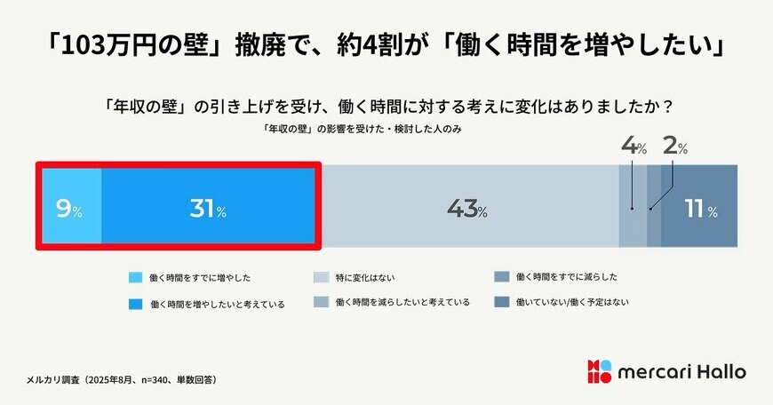 今年から制度が見直された「年収の壁」も、意識の変化に大きく影響しています。これまで「103万円の壁」により働く時間を制限していた人のうち、約4割が「今後は働く時間を増やしたい」と回答しました。