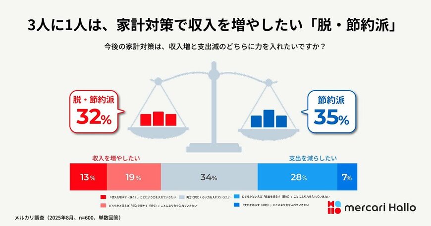 調査では、家計対策を「収入増」と「支出削減」のどちらに重きを置くかも尋ねています。その結果、3人に1人(32%)が「収入を増やす」方向を選択する「脱・節約派」であることが判明しました。