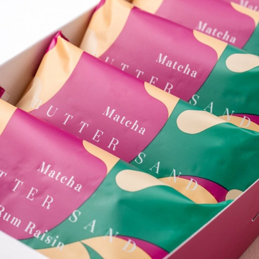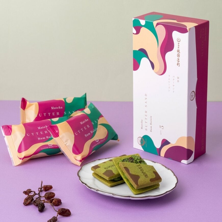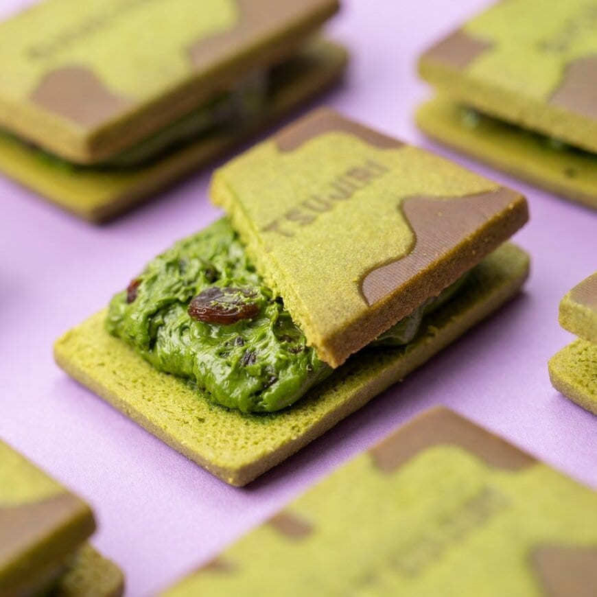 「抹茶バターサンドラムレーズン」は、祇園辻利だけで味わえるリッチな抹茶を使用したバターサンドクッキーです。上品な甘さ、なめらかなくちどけが特徴で、思わずリピートしたくなる大人のスイーツとなっています。